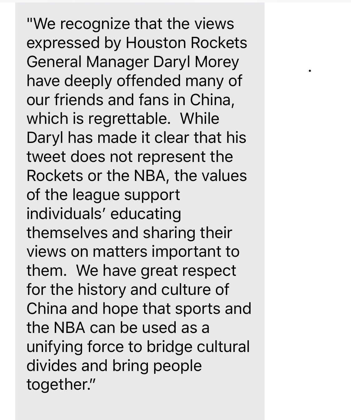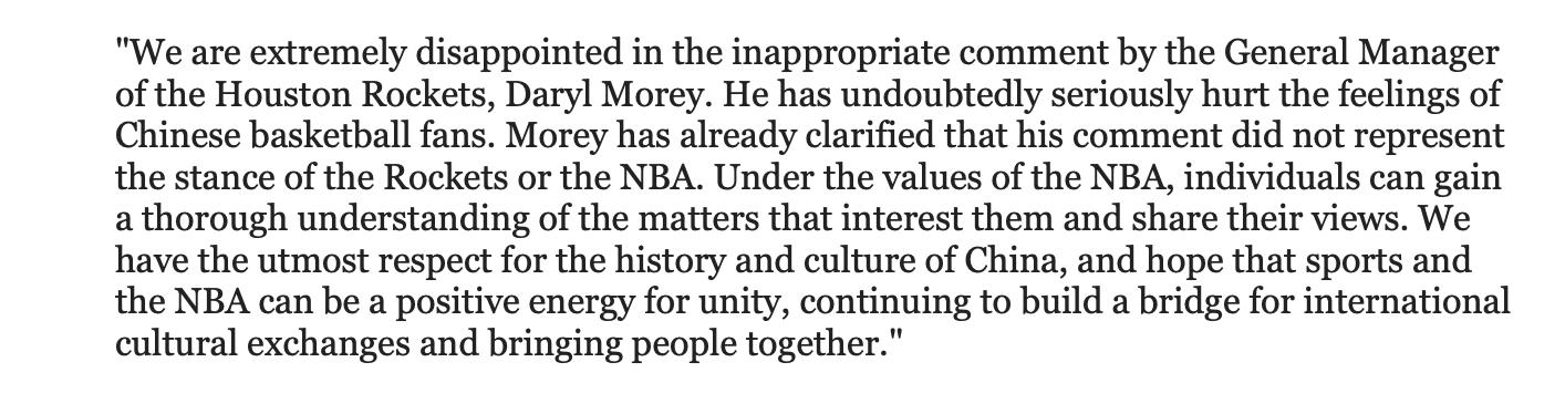 Which is what they did issue. Okay fine! That's a pretty good statement. But wait a minute wait a minute wait a minute, "his tweet does not represent the Rockets or the NBA," see you're taking sides there, you're taking the side of your friends in Zhongnanhai, not your friends in Hong Kong. Why not just say it was regrettable because although Morey evidently thought he had a First Amendment right, which we all know in America means an obligation, to speak on any goddamned thing he wants to, in fact he had no such right to speak as the general manager of the "Rockets," which is a business, whose purpose is to make yuan, and he just endangered the free flow of zillions of yuan into the pocket of his BOSS, the owner of the team?...Maybe not say all of that. Distance yourselves from official-ness of it but not the content.