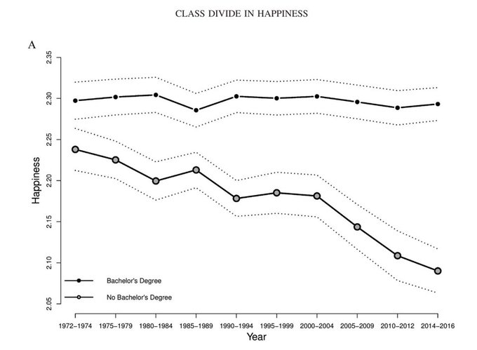 So as you can see the study ends in 2016. We could have hoped for more. The most substantial drop in uneducated White happiness occurred when? In 2004-2008. What was going on then? Not much, just the wars in Afghanistan, in Iraq, based on faulty expert judgment that Saddam Hussein possessed weapons of mass destruction (remember “yellow cake”); not based on Saddam having any involvement in the 9/11 attacks; Rumsfeld, Wolfowitz, Cheney, the best and tbe brightest, remember? The foreign policy “Dream Team”! Crap, crap, and crap. Then in aught eight, Lehman Brothers and the beginning of the Great Recession. How’s that for history repeating itself? However, before getting too committed to that graph, remember "garbage in, garbage out?” The prettiest graphical representation of data is only as good as the data itself and on that point the authors of the study who created the graph write,