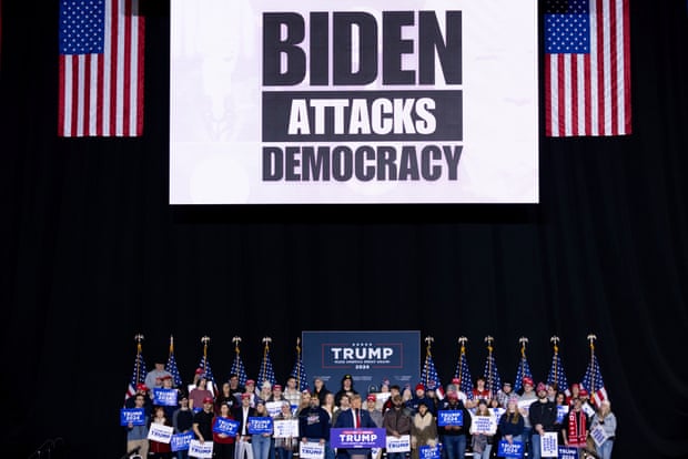 At Saturday’s rally, early in a speech lasting more than an hour-and-a-half, a giant screen above Trump’s head stated in stark black and white: “Biden attacks democracy.”